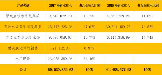公司的主營(yíng)業(yè)務(wù)為管道直飲水系統(tǒng)BOT業(yè)務(wù)、管道直飲水系統(tǒng)集成、直飲水設(shè)備的生產(chǎn)、銷售及服務(wù),其收入按產(chǎn)品類別列示如下: