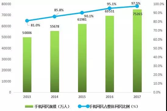 2013-2017年中國手機網(wǎng)民數(shù)量及其整體網(wǎng)民比例