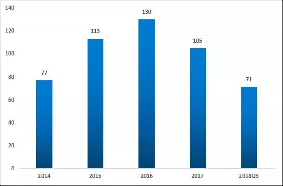 從融資數(shù)量來看,截止2018年第三季度已發(fā)生的融資事件為71件,2017至2018年融資事件較前三年熱度有所回落,可以看出資本的支撐更加的冷靜。