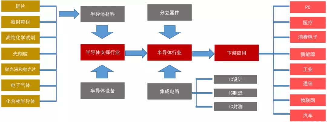 半導(dǎo)體行業(yè)具有技術(shù)難度高、投資規(guī)模大、產(chǎn)業(yè)鏈環(huán)節(jié)長、產(chǎn)品種類多、更新迭代快、下游應(yīng)用廣泛的特點(diǎn),產(chǎn)業(yè)鏈呈垂直化分工格局。半導(dǎo)體制造產(chǎn)業(yè)鏈包含設(shè)計(jì)、制造和封裝測試環(huán)節(jié),半導(dǎo)體材料和設(shè)備屬于芯片制造、封測的支撐性行業(yè),位于產(chǎn)業(yè)鏈最上游。