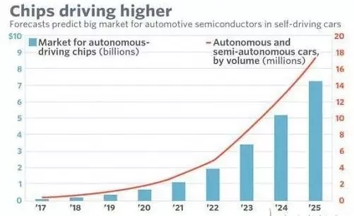 以無人駕駛汽車的智能化趨勢為例,摩根大通估計到2025年,用于無人駕駛汽車的半導體器件銷售額可達73億美元,從2017年到2025年的年復合增長率高達62.5%。2015年全球汽車半導體總銷售額不過300億美元,摩根估計平均每部車用到的芯片價值將從現(xiàn)在的300至400美元增長到2025年400至500美元。