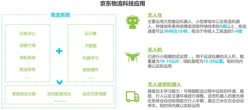 京東于2016年成立了X事業(yè)部,專注智慧物流相關(guān)技術(shù)的研發(fā)。2017年4月京東物流宣布獨立運營,成立物流子公司。截止2017年6月,京東在全國范圍內(nèi)擁有256個大型倉庫,6906個配送站和自提點,包括已經(jīng)運營了7個大型智能化物流中心“亞洲一號”。目前京東自營配送覆蓋了全國98%的人口,壓縮商品流通成本70%,提升物流運營效率2倍以上。京東物流科技的應用主要包括兩個方面,一是基于大數(shù)據(jù)預測分析技術(shù)實現(xiàn)智能化的調(diào)度、決策;二是采用一些更自動化、智能化的設備提升物流效率,最終提升客戶的體驗。