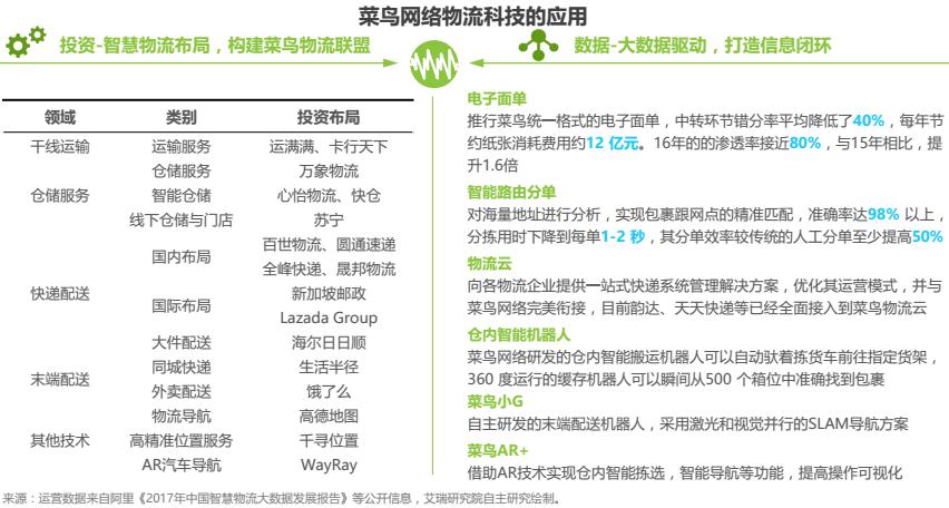 菜鳥網(wǎng)絡成立于2013年5月,定位于以數(shù)據(jù)驅(qū)動、社會化協(xié)同的物流及供應鏈平臺。主要業(yè)務有倉配網(wǎng)絡、跨境網(wǎng)絡、快遞平臺和ET.物流實驗室,以覆蓋全國的倉配網(wǎng)絡和大數(shù)據(jù)決策平臺為基礎,構(gòu)建專業(yè)高效的供應鏈服務。為了提高網(wǎng)絡效率,一方面菜鳥以投資參股的形式構(gòu)建菜鳥聯(lián)盟,另一方面加大科技研發(fā)的投入,積極布局智慧物流。