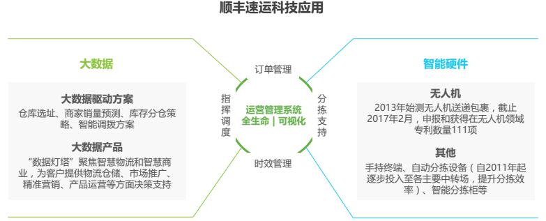 順豐速運成立于1993年,截止2016年12月,順豐控股業(yè)務覆蓋全國331個地級市、2620個縣區(qū)級城市,近13000個自營網(wǎng)點。順豐速運業(yè)務包括國際業(yè)務、同城配送、冷運、重貨(陸路&航運)等。順豐一貫重視在信息化領域的投入,負責集團信息系統(tǒng)研發(fā)與運維的科技人員超過2,000名,16年信息技術(shù)費投入2.6億、占營業(yè)成本0.57%,相較15年提升0.08個百分點。14-16年來,順豐控股申報和獲得的專利523項,軟件著作權(quán)200多項。未來,順豐還將繼續(xù)擴大在科技領域投入,不斷提高各方面的科技與智能化水平。