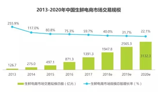 2017年中國生鮮電商市場交易規(guī)模約為1391.3億元,同比增長59.7%,預計2020年,生鮮電商交易規(guī)模可以達到3132億元。一方面基于消 費者消費習慣養(yǎng)成,另一方面基于冷鏈和倉儲系統(tǒng)迅速完善。