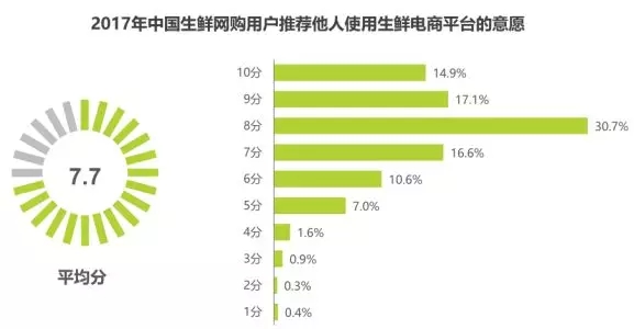 生鮮網購用戶推薦他人使用的意愿較強,整體推薦意愿的平均分為7.7分。30.7%的用戶推薦他人使用的意愿為8分,17.1%的用戶推薦他人使用的意愿為9分,14.9%的用戶推薦他人使用的意愿為10分。