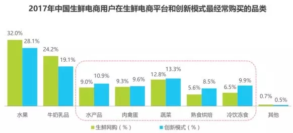 水果、乳品是創(chuàng)新模式最受歡迎的品類,在創(chuàng)新模式購買水產品、肉禽蛋及蔬菜等品類用戶占比更高。