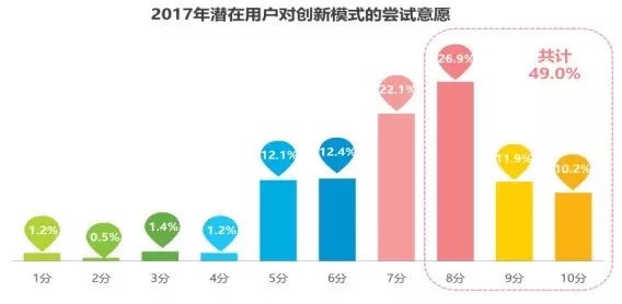 潛在用戶對創(chuàng)新模式的嘗試意愿較高,嘗試意愿在8分及以上的用戶占比接近一半。