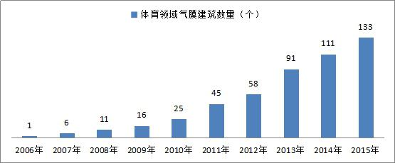 目前,世界上已經(jīng)建成有上萬個(gè)氣膜建筑了,2011年以后中國氣膜場地的數(shù)量迎來集中爆發(fā)期,全國每年新增項(xiàng)目數(shù)量基本穩(wěn)定在30個(gè)以上。截至2015年末,我國氣膜建筑總項(xiàng)目數(shù)達(dá)到215個(gè),建筑面積達(dá)到88.76萬平方米;其中,現(xiàn)存的項(xiàng)目數(shù)量和建筑面積分別為197個(gè)和78.60萬平方米,現(xiàn)存率在90%左右。氣膜建筑可以應(yīng)用的范圍非常廣闊,但是我國目前還是作為運(yùn)動(dòng)場館的比較多,市場接受度也比較高。隨著社會(huì)對環(huán)保的關(guān)注,企業(yè)經(jīng)營過程中環(huán)保的成本要求越來越高,未來在工業(yè)領(lǐng)域,氣膜建筑還有更廣泛的應(yīng)用。