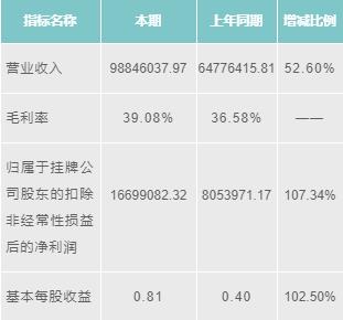博德維2016年?duì)I業(yè)收入為98846037.97元,增長52.60%;毛利潤為39.08%;歸屬于掛牌公司股東的扣除非經(jīng)常性損益后的凈利潤為16699082.32元,增長107.34%;基本每股收益為0.81元/股,增長102.50%。
