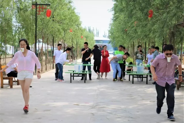 裁判員一聲令下,考驗團隊協(xié)作力量的趣味傳水比賽正式開始,終點水桶里的水在雙方隊員的來回往返中不斷增加;
